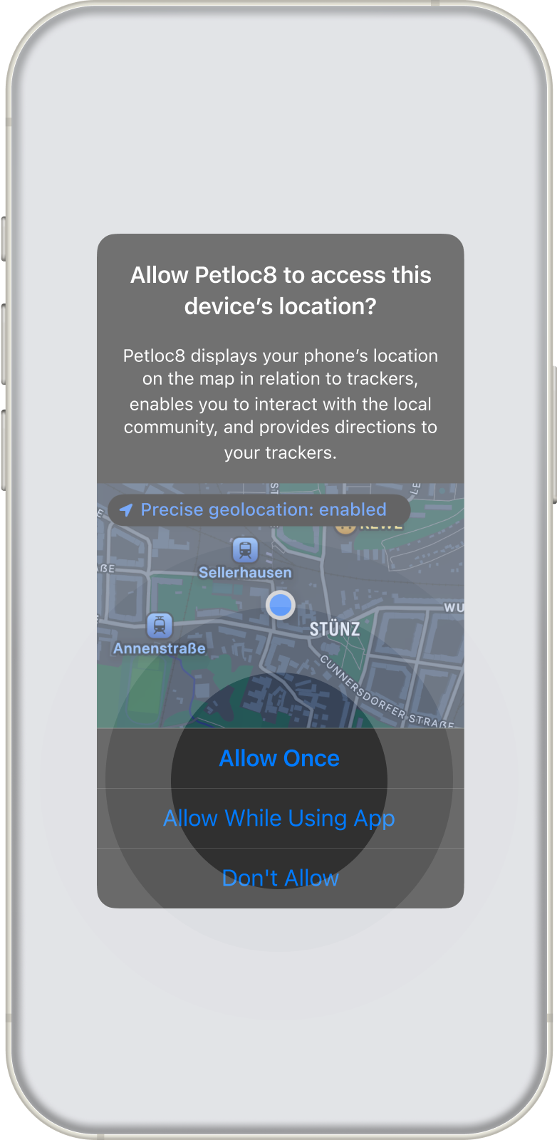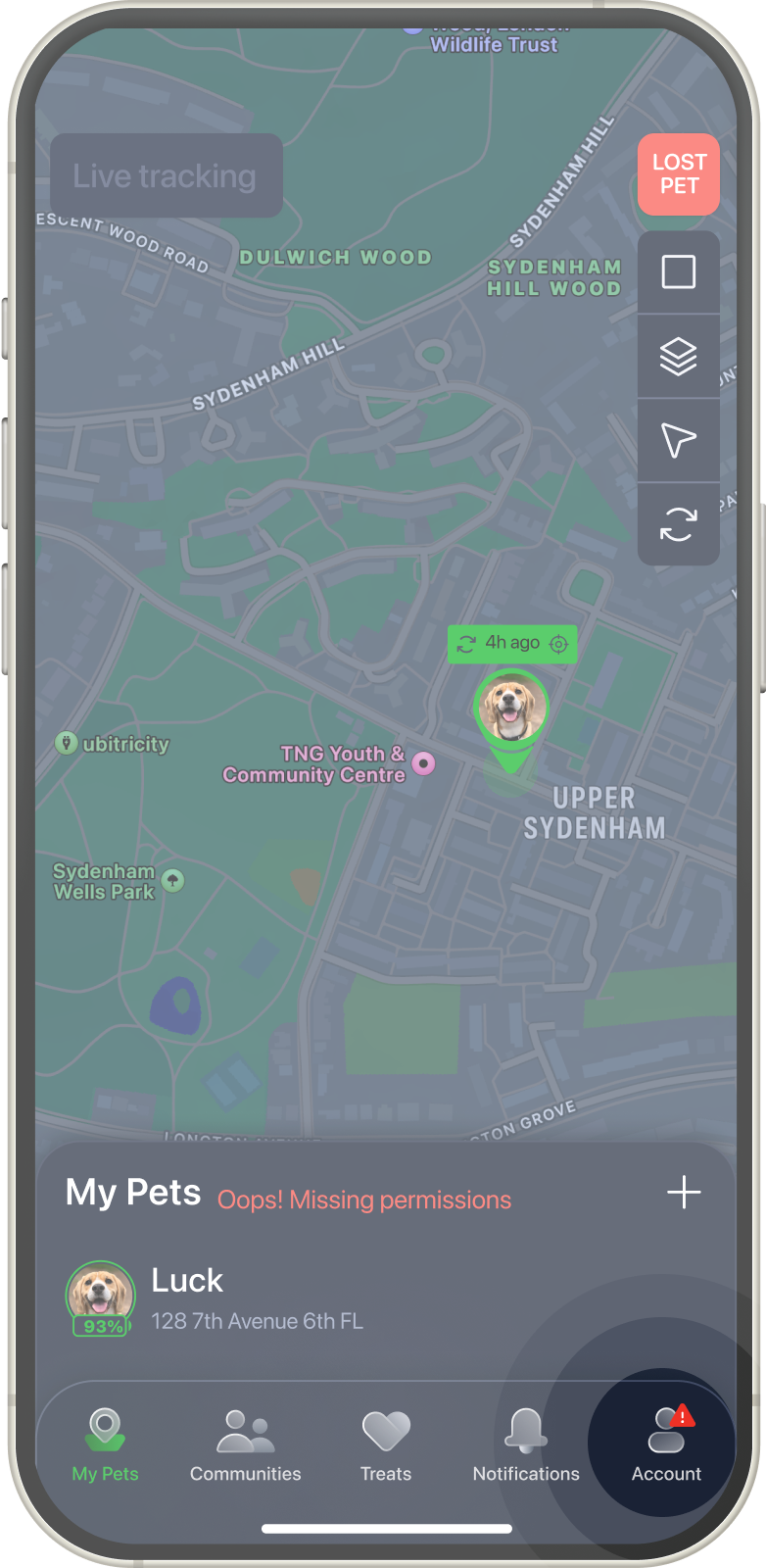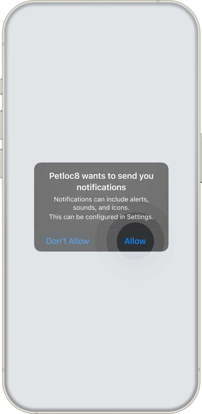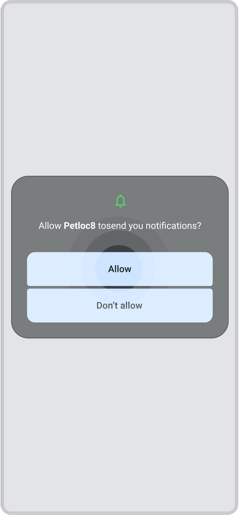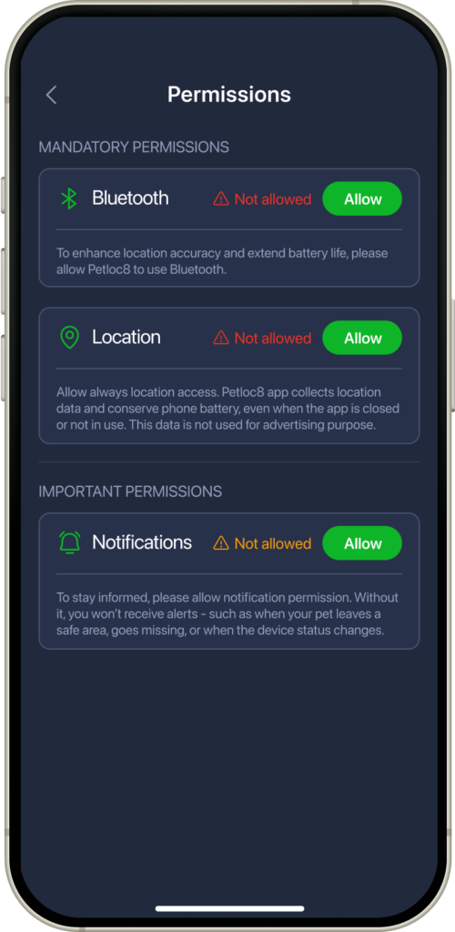Notification permission needs to stay informed. Without it, you won’t receive alerts - such as when your pet leaves a safe area, goes missing, or when the device status changes.