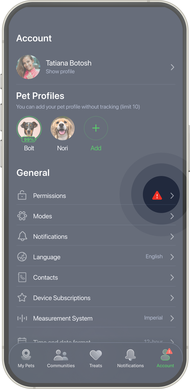 If any of mandatory permissions are not allowed - on the My Pets tab appears red text notification and attention icon on Account tab. You can always manage permissions status and turn on required yourself in the app's account.