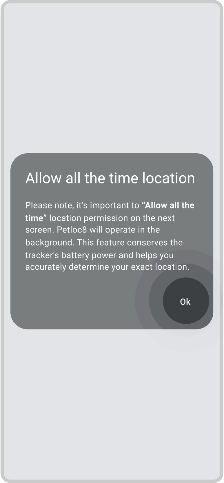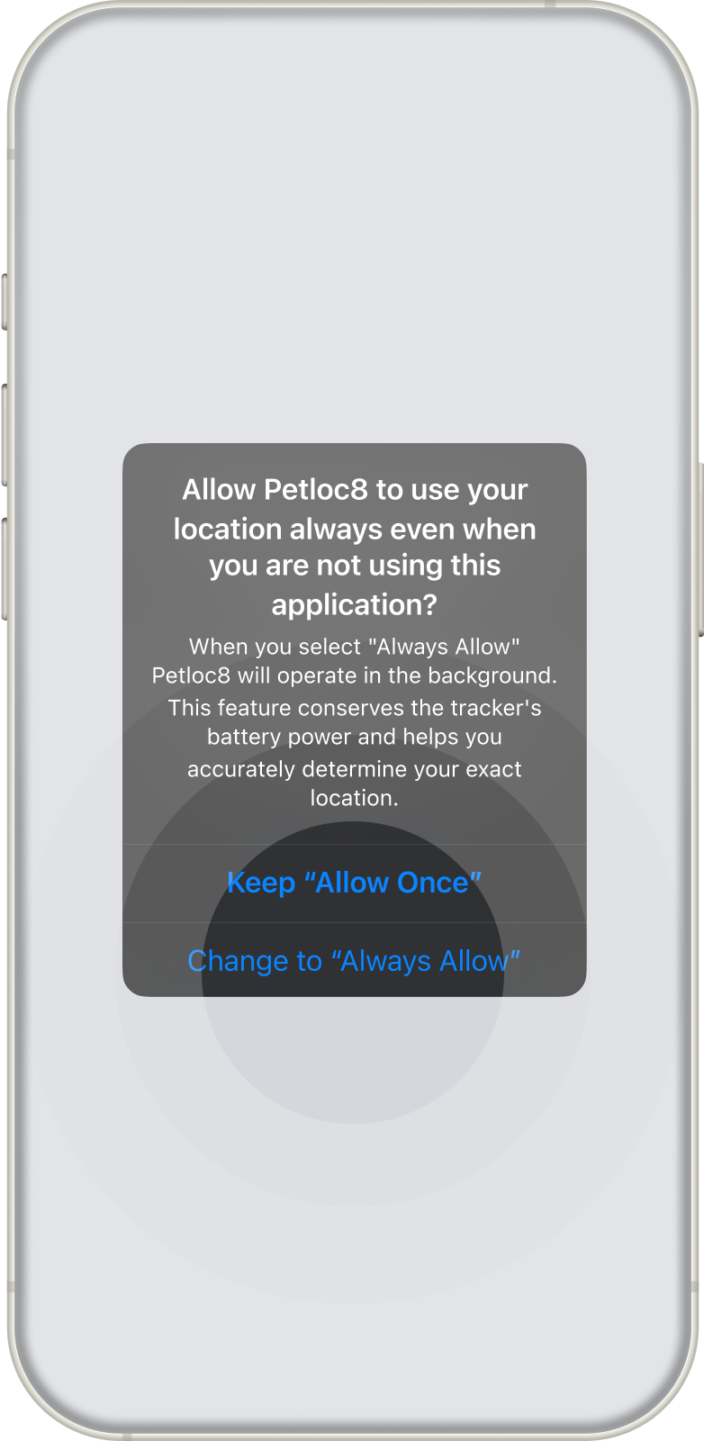 For tracking your pet critical permission is Allow always (iOS) or Allow all the time for (Android) location. Petloc8 app collects location data and conserve phone battery, even when the app is closed or not in use.