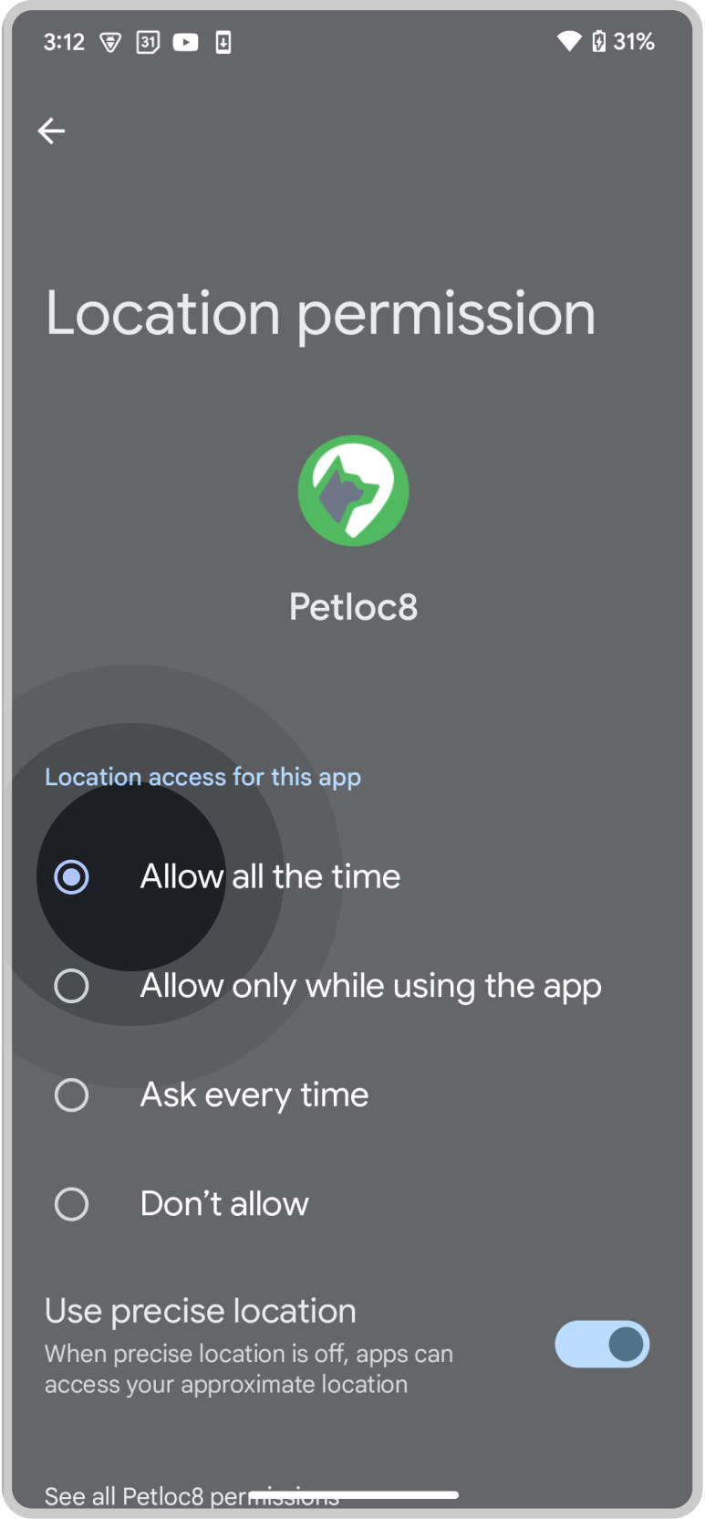 Step 3 - On your phone open Settings > Apps > Petloc8 > Permissions > Location permission and choose “Allow all the time”.
